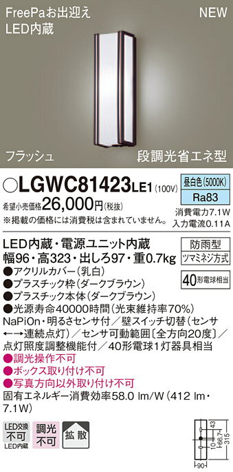 商 品 詳 細商品名パナソニック エクステリアライトメーカー名パナソニック Panasonicメーカー器具名称エクステリアライト ブラケットライト ポーチライト(玄関廻り)仕様◆LED(昼白色タイプ) ◆光源色温度:5000 K ◆光源寿命40000時間(光束維持率70%)◆幅:96 mm ◆高:323 mm ◆出しろ:97 mm◆質量:0.7 kg◆器具光束:412 lm ◆電圧:100 V ◆消費電力:7.1 W ◆消費効率:58 lm/W◆デザイン分類:Natural◆【アクリルカバー】乳白◆【プラスチック枠】ダークブラウン◆【プラスチック本体】ダークブラウン◆Ra83◆NaPiOn・明るさセンサ付◆壁スイッチ切替(センサ←→連続点灯)◆センサ可動範囲〔全方向20度〕◆点灯照度調整機能付◆40形電球1灯器具相当◆入力電流(100V時):0.11 A◆調光操作不可◆ボックス取り付け不可◆写真方向以外取り付け不可注意事項◆写真方向以外取り付け不可 ※施工・電気工事は専門業者にご依頼ください。